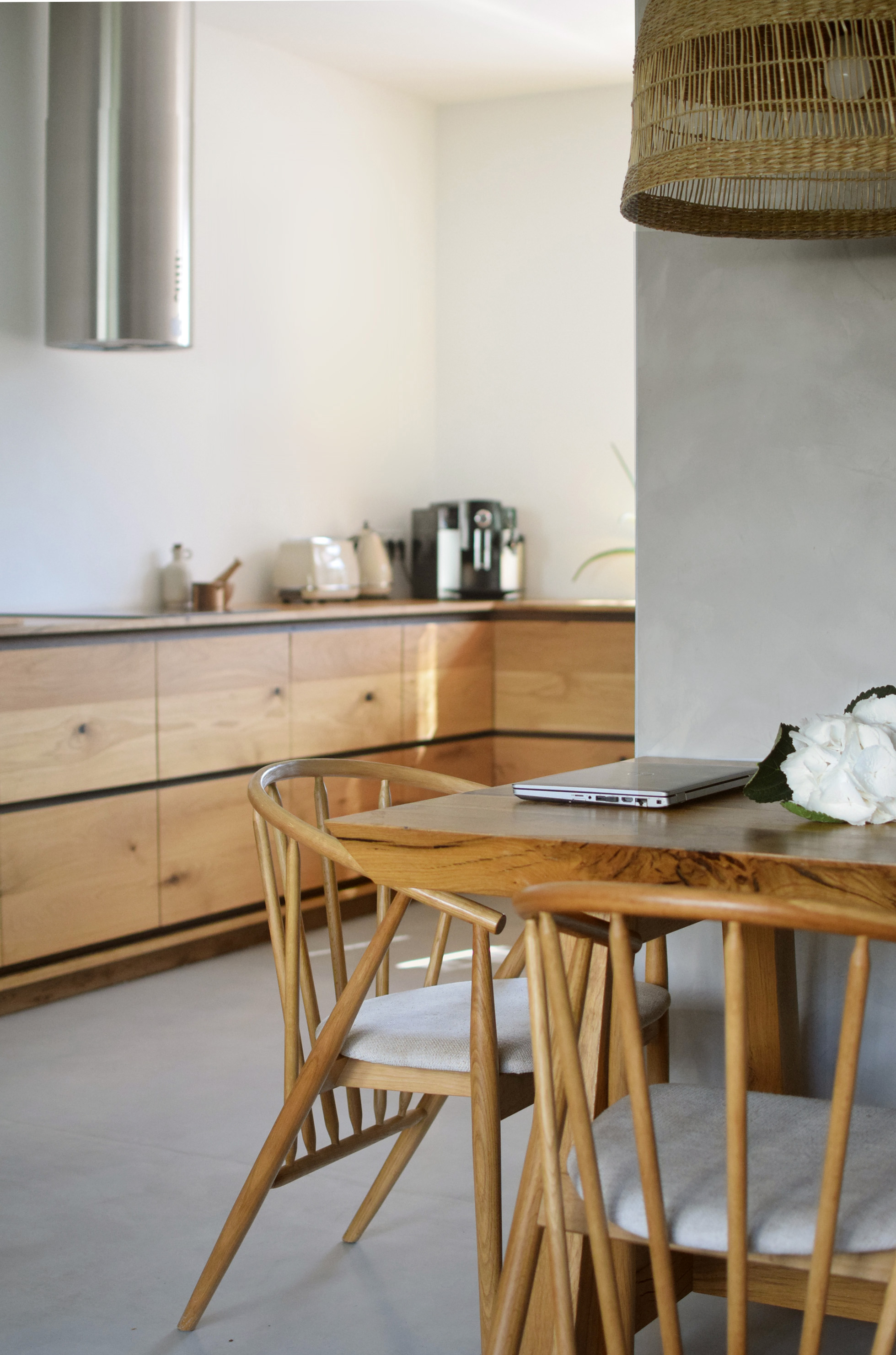 Projekt miał nawiązywać do surowej stylistyki japońskiej, ocieplonej wakacyjną bryzą. Dzięki konsekwencji projektowej i zachowaniu wierności wybranym materiałom uzyskaliśmy bardzo prójne sytlistycznie wnętrze, od holu wejściowego aż do łazienki. Masywne meble z litego drewna oraz cementowe wykończenie ścian i podłóg są podstawą tego wnetrza. Stawiając na naturalne materiały w z pełną świadomością akceptujemy ich naturalne procesy starzenia wraz z postępem czasu. Swiatomość przemijania przeplata się w tym wnnętrzu z filozofią wabi-sabi, mocno zakorzenioną w japońskiej kulturze.