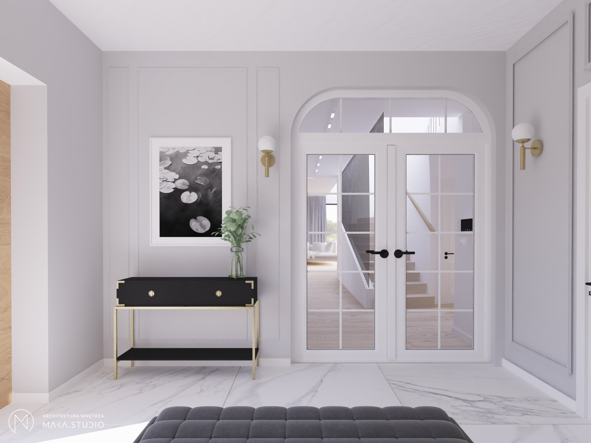 Wnętrze luksusowego apartamentu w Gdyni charakteryzuje otwarta przestrzeń salonu i kuchni, utrzymana w formie udomowionego minimalizmu z dekoracyjnym detalem. Nowoczesne formy łączą się z klasyczną sztukaterią, na która pozwoliła nam znaczna wysokości pomieszczeń. Również ścienna boazeria nawiązuje do klasycznych form dekoracji, występująca jednak w oszczędnej formie, jest jej nowoczesną wersją. Wnętrze utrzymane w jasnych kolorach z przewagą bielonego drewna i szarości, przełamane zostało czarnymi akcentami mebli i wykończeń.